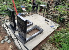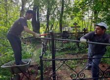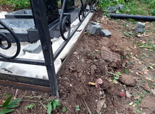 Когда памятники были готовы, мы приступили к работам на участке. В первую очередь мы очистили могилу от сорной травы, а затем вкрутили сваи, которые в дальнейшем будут опорами для памятников.